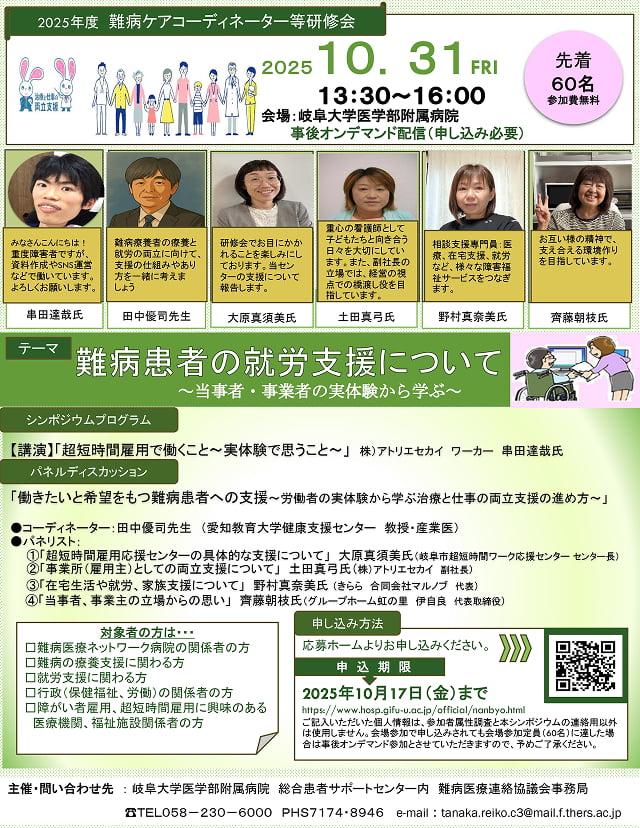令和7年度難病ケアコーディネーター等研修会本研修会に申込み頂き誠にありがとうございます。本研修会が皆様の難病医療に少しでもお役に立てれば幸いでございます。