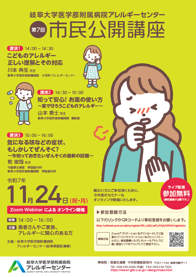 今回は、岐阜大学医学部附属病院 小児科 川本 典生先生より「こどものアレルギー 正しい理解とその対応」について、岐阜大学医学部附属病院 薬剤部 山本 泰士先生より「知って安心!お薬の使い方~薬で守ろうこどものアレルギー~」について、さらに今回は、成人のぜんそくについて「気になる咳などの症状、もしかしてぜんそく?~今知っておきたいぜんそくの最新の話題~」を中濃厚生病院 岐阜大学医学部附属病院 呼吸器内科 乾 俊哉先生にご講演いただきます。