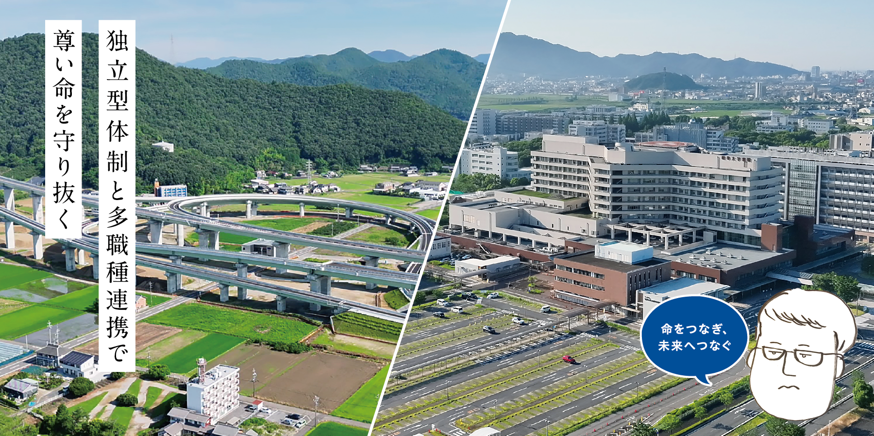 |  岐阜県ドクターヘリは2011年から運航開始。 当院を基地病院として土日祝も休まず運航しています。 |  救急外来での初期対応から手術、集中治療、さらに退院後を見据えた支援まで、一貫して担います。 |