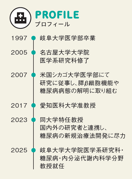 私は岐阜大学を卒業後、国内外の大学病院で診療・研究・教育に携わり、糖尿病と肥満症の病態解明と治療法の開発に取り組んできました。専門は内分泌・代謝内科で、とりわけ膵β(ベータ)細胞の研究に注力してきました。肥満であっても糖尿病を発症しない人が存在するのは、膵β細胞が十分にインスリンを分泌できているためです。つまり、膵β細胞の量や機能を増強できれば、糖尿病の"根治"も夢ではないと考えています。現在は、膵β細胞を若返らせるリプログラミングや、細胞減少の原因解明、増殖因子の探索などの研究を進めています。「糖尿病は治らない病気」といわれますが、この可能性に光をあてて基礎と臨床をつなぐことで、新しい治療法の創出を目指しています。いつか患者さんに「治る」という希望を届けられるよう、挑戦を重ねていきます。