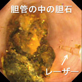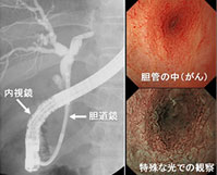 胆管は肝臓でつくった胆汁(脂肪の吸収を助ける液)を十二指腸に運ぶ管です。近年、機械の開発により内視鏡を極めて細くすることが可能になり、胆管の中を内視鏡で直接観察することができるようになりました。通常の内視鏡の中に細い内視鏡(胆道鏡)を挿入し、十二指腸にある胆管の出口からこの胆道鏡を挿入して胆管内の病変を観察します。胃や大腸の内視鏡検査と同様に病変部の生検を行うことはもちろん、さらに最近では特殊な光を当てて異常な病変部を強調することもできるようになりました。また、胆管の中の胆石に直接レーザーを当てて破砕することもできるため、これまで治療が難しかった胆管の中のひじょうに大きな石や取り出しにくい場所にある石も、治療を行えるようになりました。