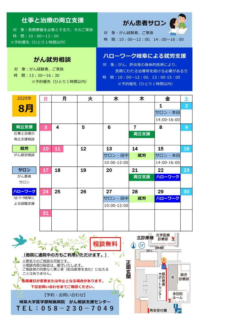 令和7年8月のがん就労相談とがん患者サロンの開催日をご案内いたします。