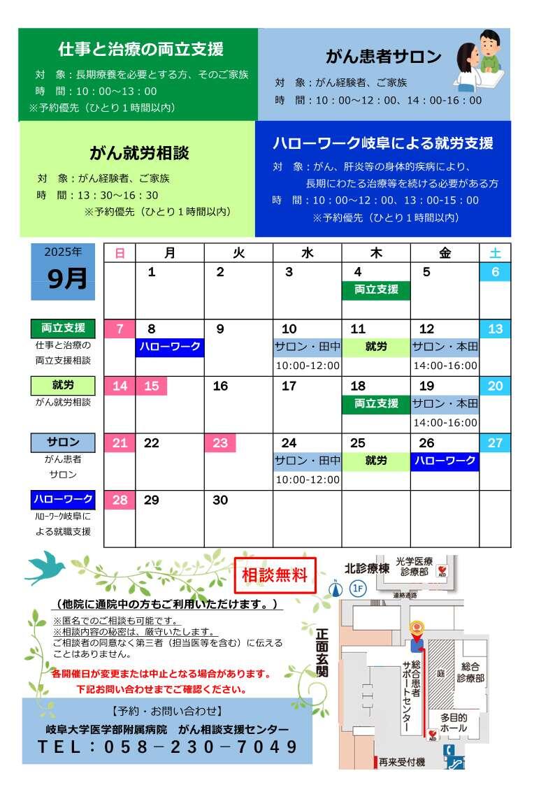 令和7年9月のがん就労相談とがん患者サロンの開催日をご案内いたします。
