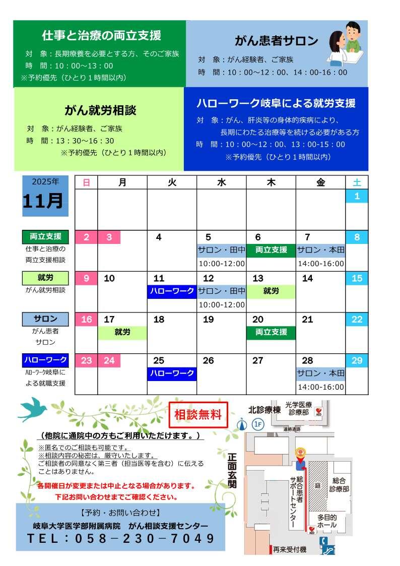 令和7年11月のがん就労相談とがん患者サロンの開催日をご案内いたします。