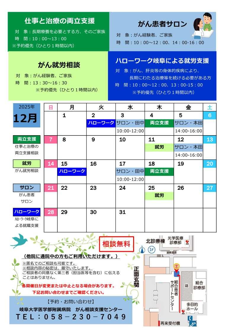 令和7年12月のがん就労相談とがん患者サロンの開催日をご案内いたします。