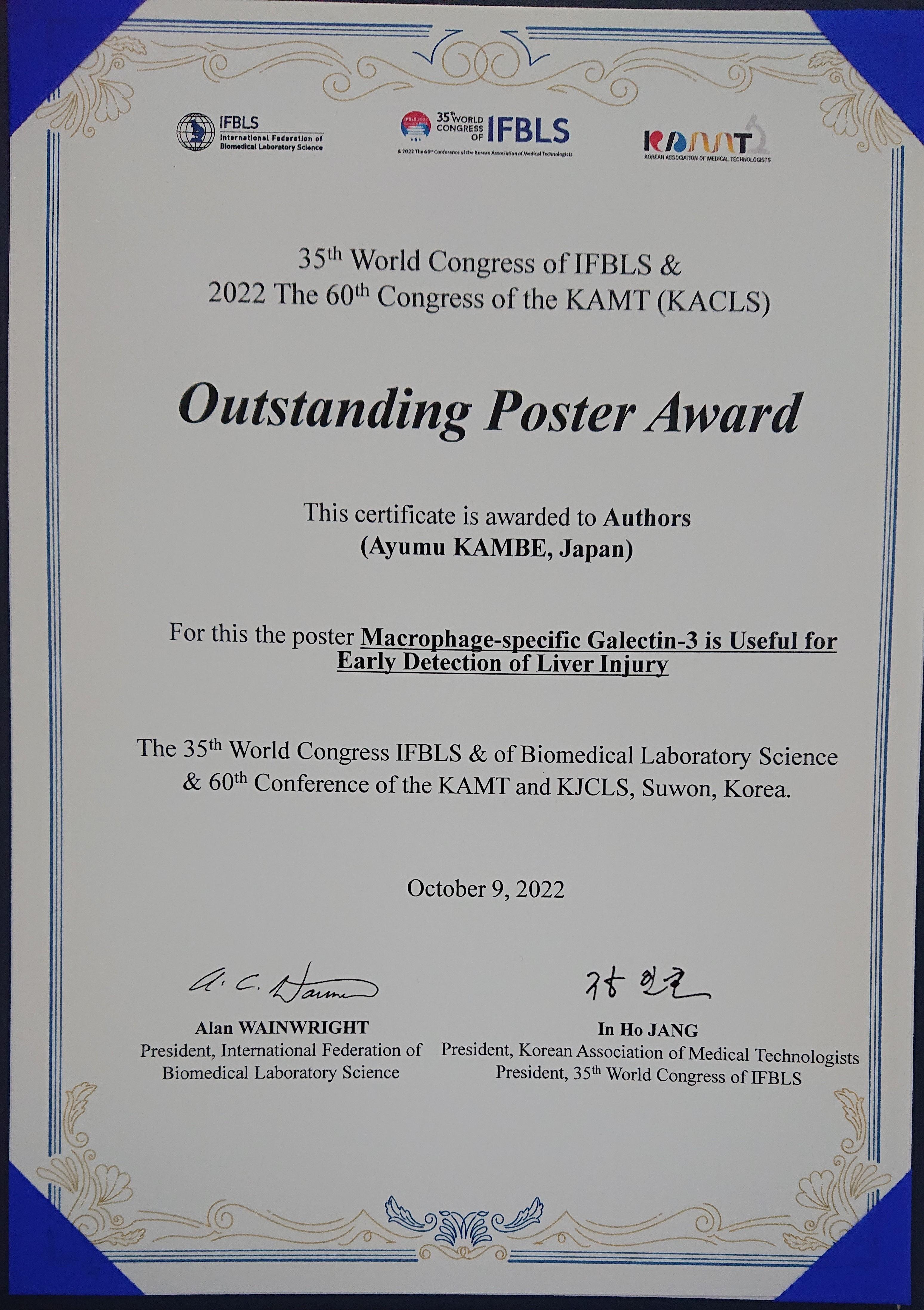 神戸技師は、IFBLS2022において二つ目の受賞になります。