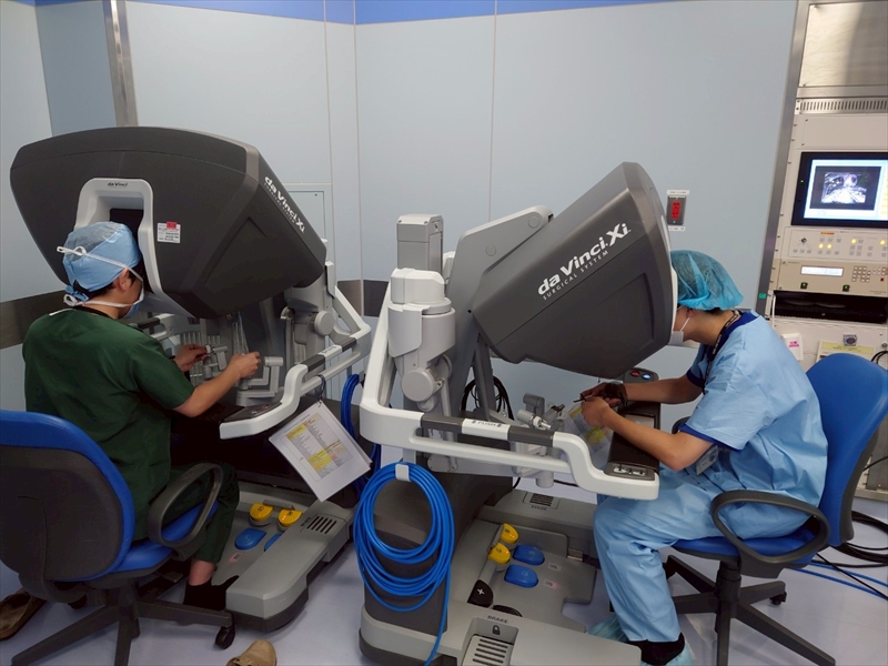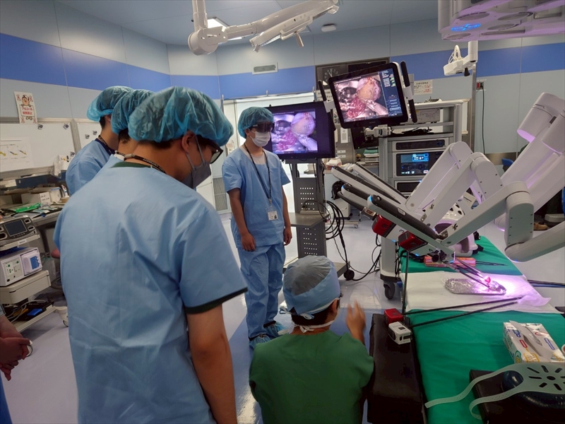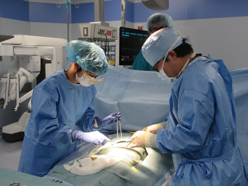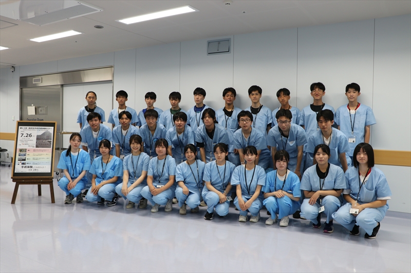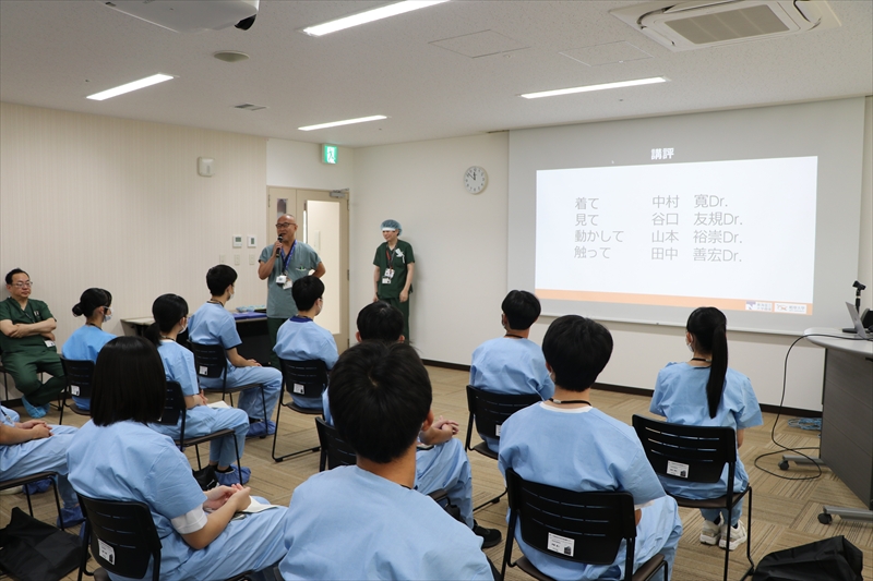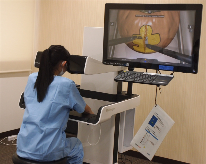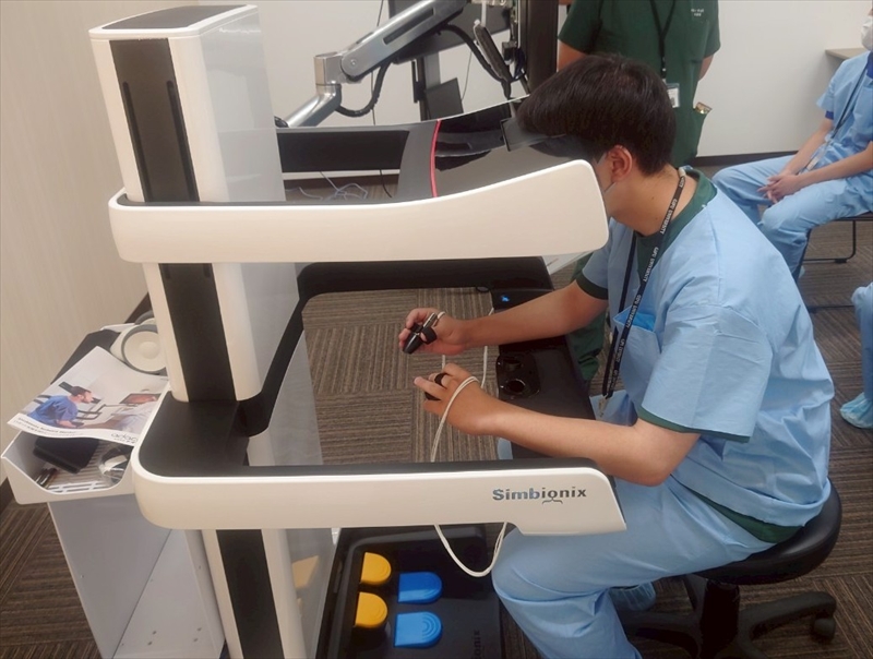 【参加人数】20名 【講習内容】 手術体験してみよう! 着て 実際の手術で使用する手術用ガウンを清潔ガウンテクニックで着てみよう! 見て ダヴィンチ(手術支援ロボット)が動いているところを見てみよう! 触って 鏡視下手術での鉗子を使用して、鏡視下手術を体験しよう! 動かして VRトレーニングシュミレーターで、ロボット下手術を体験しよう!