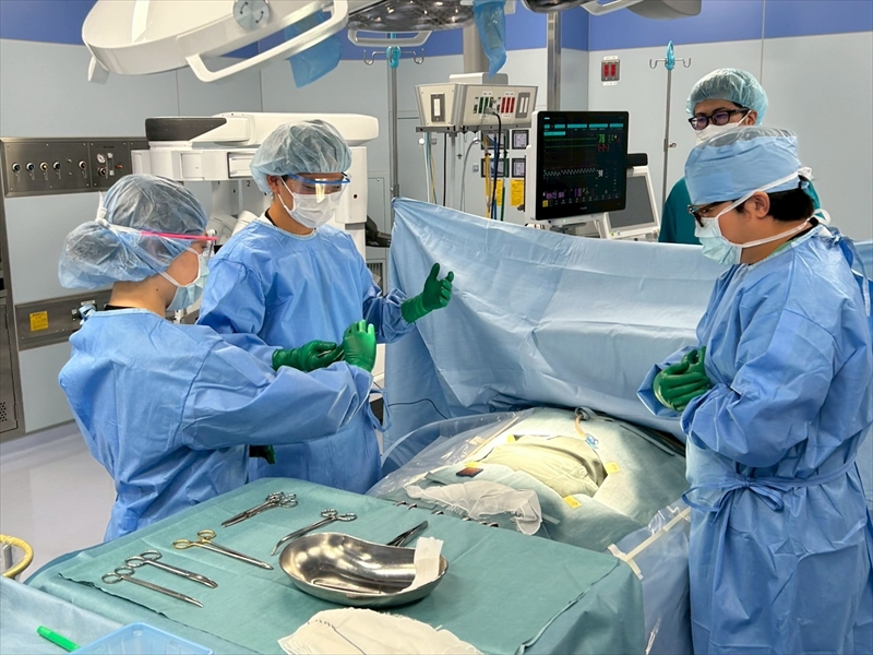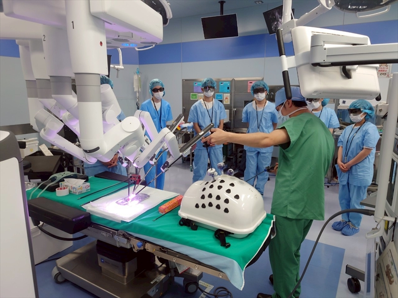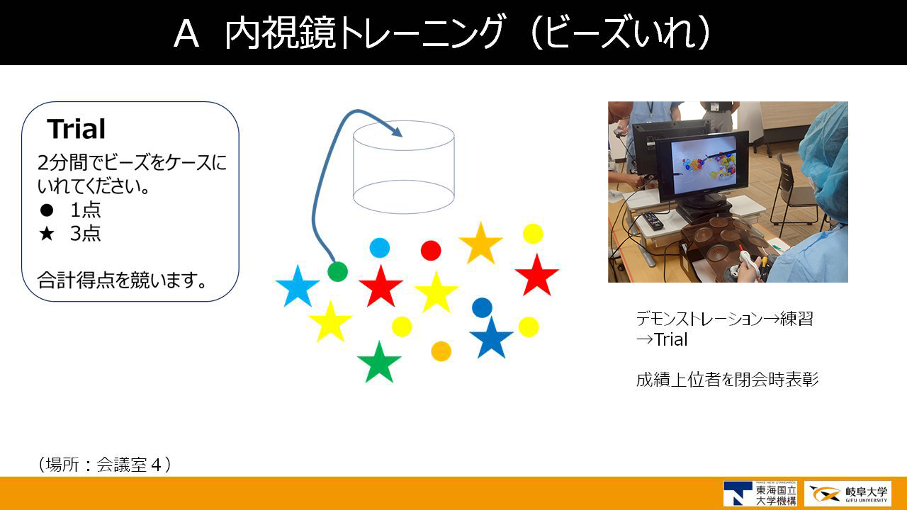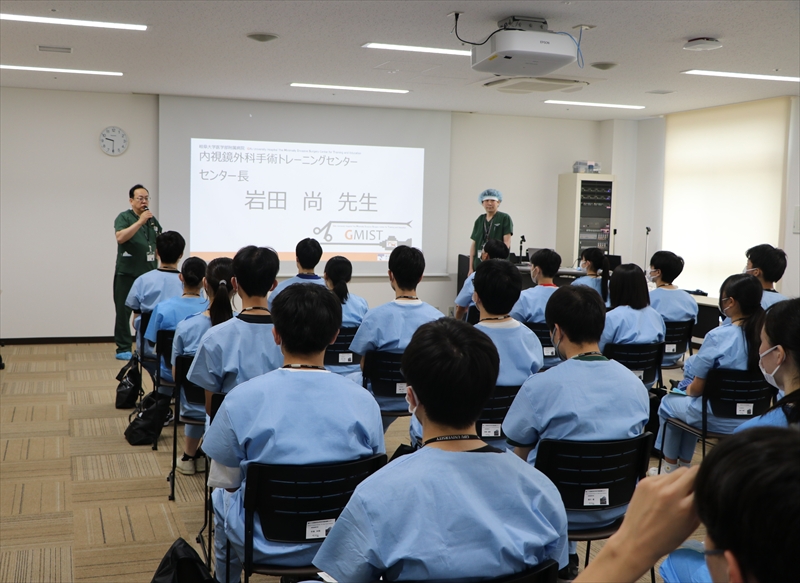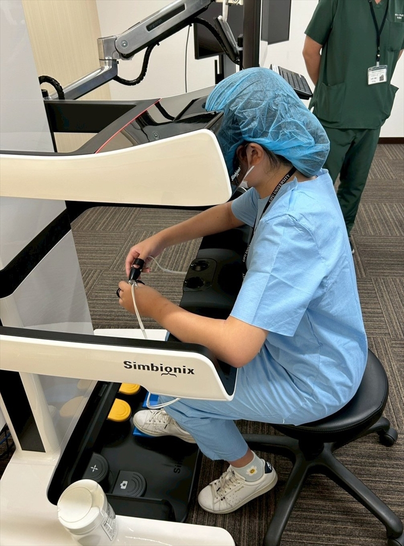 【参加人数】20名 【講習内容】 手術体験してみよう! 着て 実際の手術で使用する手術用ガウンを清潔ガウンテクニックで着てみよう! 見て ダヴィンチ(手術支援ロボット)が動いているところを見てみよう! 触って 鏡視下手術での鉗子を使用して、鏡視下手術を体験しよう! 動かして VRトレーニングシュミレーターで、ロボット下手術を体験しよう!