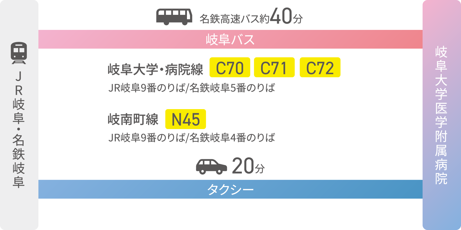 | JR | 東海道線「岐阜駅」で下車 |
