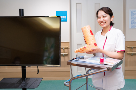 また、毎日の糖尿病教室の企画や毎年、糖尿病週間の開催にも力を注いでいます。看護師全員がお互いを思いやり、お互いさまの精神で支え合い助け合える病棟です。