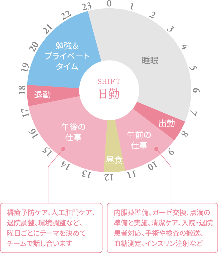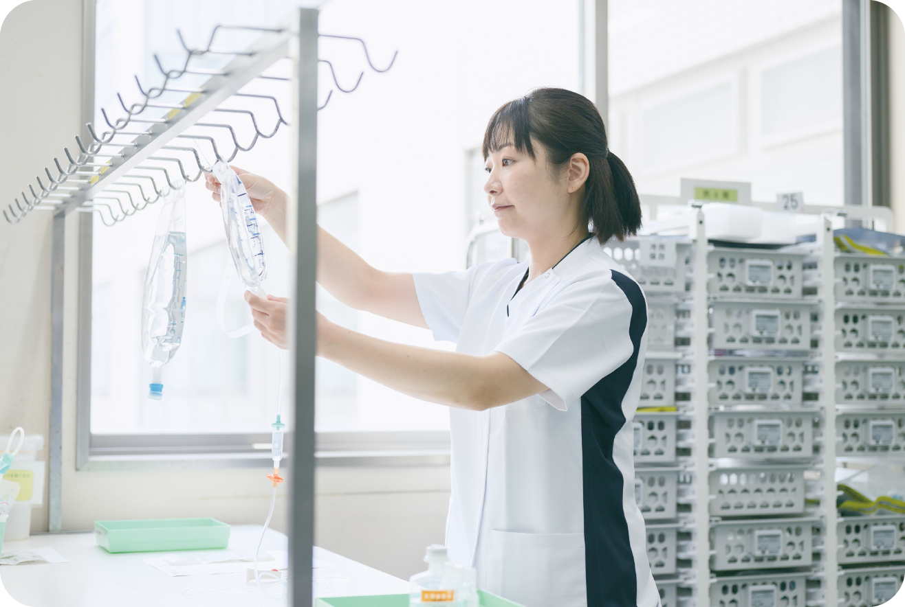 高度な技術や知識を学べ、自宅から近かったので当院で働くことに決めました。現在は消化器外科で患者さんの清潔ケア、点滴、精神的ケア、ストーマケア、術後管理、リハビリなどを担当しています。また、褥瘡(床ずれ)やクリニカルパス(入院患者の治療や検査のスケジュールを時系列に沿ってまとめた計画書)係、自治会委員も務めています。術後合併症を発症せずに患者さんのADL(日常生活動作)が回復したり、ストーマを造設した患者さんがストーマケアを自立してできるようになり、退院された時にやりがいを感じます。私が感じる当院の魅力は、充実した新人看護師のサポート体制。丁寧でしっかりした指導だけど、距離を感じさせない雰囲気で働きやすい職場です。