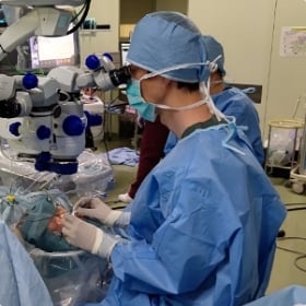 手術は、目の黒目と白目の境あたりに数ミリの切り込みを入れて行います。そこから器具を入れて、濁った水晶体を超音波で砕いて吸い取り、そこに水晶体の代わりになる新しい透明な眼内レンズというものを入れます。手術時間は水晶体の硬さなどにもより、患者さんごとに異なります。手術技術の向上、手術機器の安全性が高まり、非常に安全に手術ができる病気ですが、合併症も皆無ではありません。