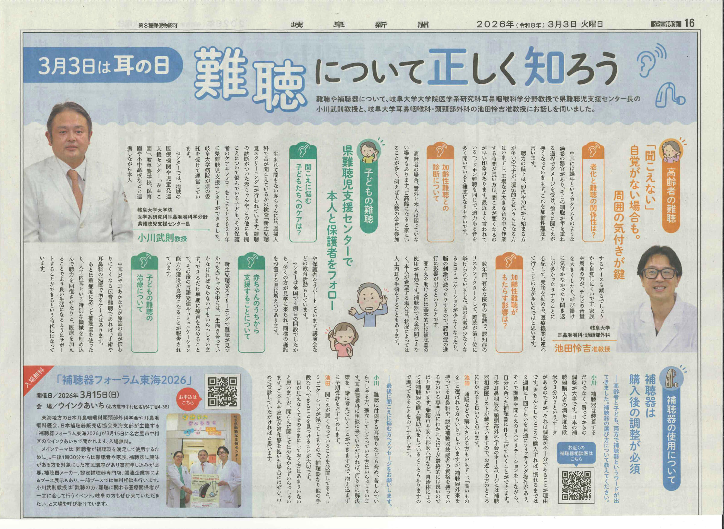 2026年3月3日(火)岐阜新聞16面「3月3日耳の日 難聴について正しく知ろう」に、