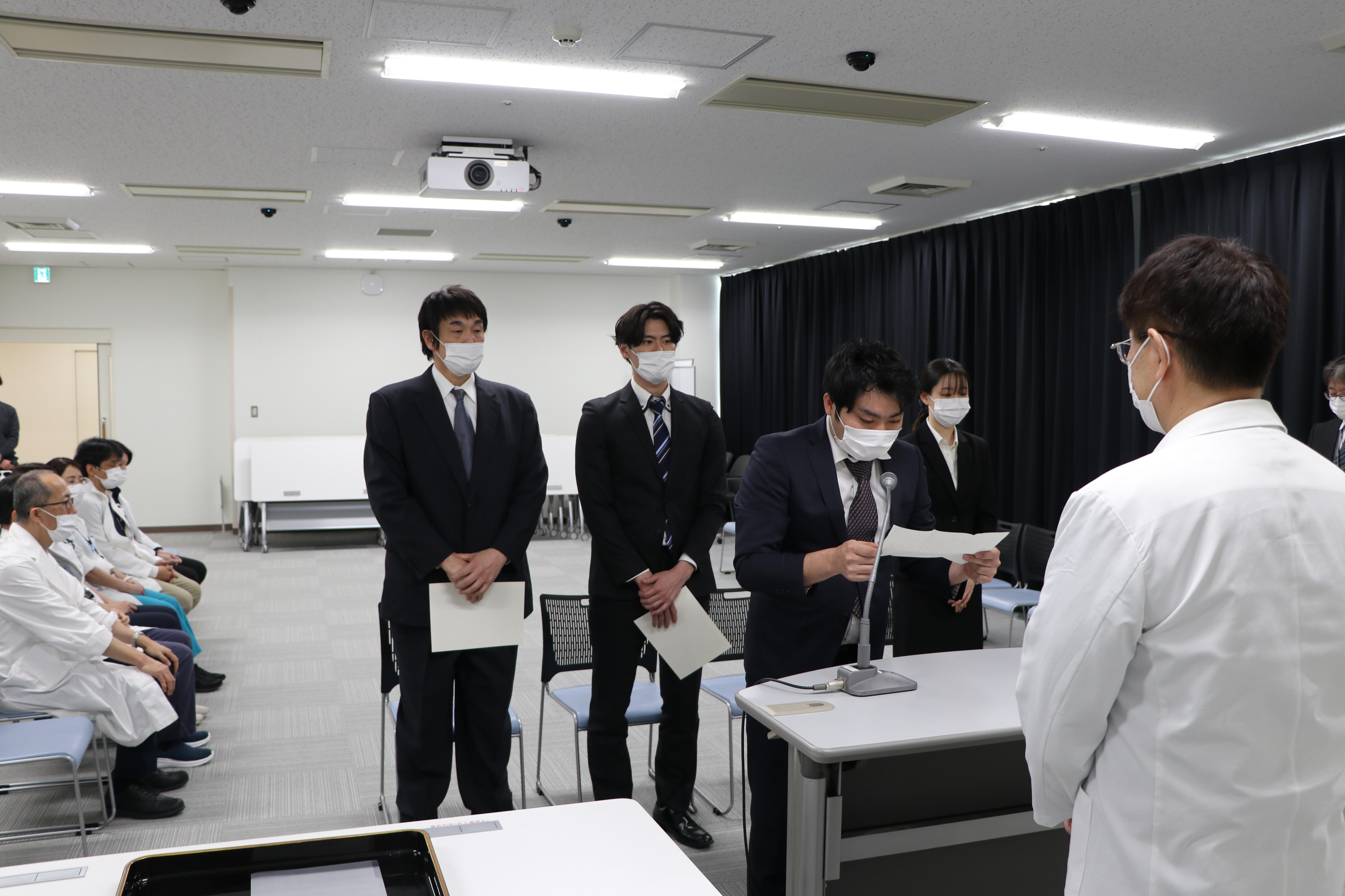 高度救命救急センターに勤務している研修生代表は「研修で得た知識、技術を用いて、緊急度・重症度を繰り返し評価することや、患者の訴えや身体観察から病態をアセスメントし、迅速な特定行為の実践を行い、重症化の予防に努めます。」と抱負を語りました。